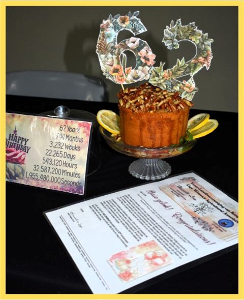 Met ‘n heerlike heuningkoek, vir ons gebak deur Rachelle, wat ook sameroepster van Landbou en Tuinbou is, vier ons, ons tak se 62ste verjaarsdag op 20 April sal wees. Ons het ook pragtige gelukwensing vanaf die VLVK President, Mev. Hannelie Low ontvang.