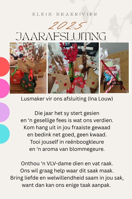 VLV Klein-Brakrivier het gesellig en in feestelike gees die jaar afgesluit. Tydens die geleentheid is Ria van Staden se 80ste verjaarsdag ook gevier. Ons het van Miens Willers afskeid geneem na ‘n vol en aktiewe 31 jaar diens by ons. Ons wens haar ‘n welverdiende rustiger pad vorentoe. Petro Reinke was die báie gelukkige ontvanger van ‘n spesiale lappop vir ‘n kleinkind.