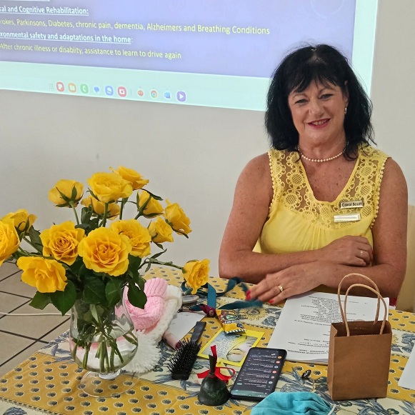 Yellow meeting – Carol Scott sitting at the chairladies table beautifully decorated in yellow with yellow roses