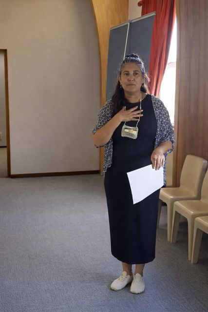 Henrietta Roux, Kuns en Handvlyt-saamroeper van VLV Vredenburg, verduidelik die simboliek van die nuwe takvaandel aan lede voor die onthulling.