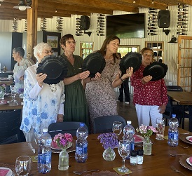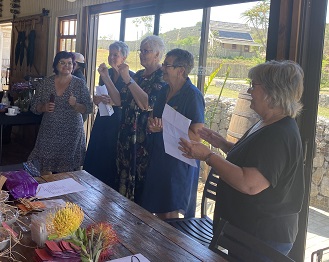 Nadat Sandra Nolte die bedankings gedoen het, het Elmarie Neethling die tafelgebed gedoen. Daarna is ‘n heerlike middagete, voorberei deur chef RenéWolmarans, voorgesit met ‘n Suurlemoen kaaskoek jogurt panna cotta met rooibosjel pêrels en heuningkoek (meer as net ‘n mondvol) as nagereg. Voorwaar ‘n gepaste bederf aan die einde van ‘n vrolike gekuier!